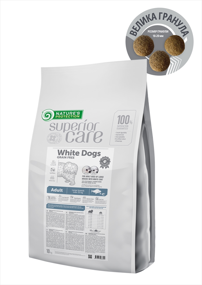 Nature‘s Protection Superior Care White Dogs Grain Free with White fish for Adult Large Breeds is known for its well-balanced composition and raw materials which help to fight against brown tears stains and to keep healthy skin and coat. The main source of protein in this complete dry dog food is white fish. It is hypoallergenic, easily digestible, perfect for weight control and a great source of vitamins A and D. It also contains Antarctic krill, a unique and 100 sustainable source of Omega-3 and choline for healthy development. The complete and balanced composition of this dry dog food is enriched with clinoptilolite of volcanic origin from nature – MicroZeoGen. It helps to remove toxins from the pets body and when it is detoxified the efficient nutrients, vitamins, and minerals easily absorb into the body. The composition is enriched with superior sources of Omega-3 fatty acids that could help to maintain the intensive colour of the coat and the perfect condition of the skin.