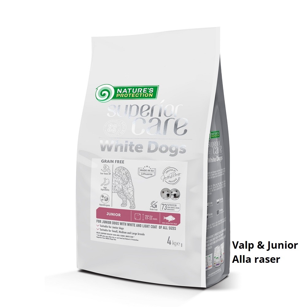Natures Protection Superior Care dry Grain Free pet food with White Fish for Junior Dogs of All Sizes with a White and Light–colored Coat is known for its well-balanced composition and raw materials. This feed kibble size is very versatile. Measuring 13-15 mm, it suits dogs of all sizes. It is perfect for larger breeds who prefer eating smaller kibble, allowing them to eat more at once and improve their digestion system. For young dogs that love bigger kibble, it is a favorable choice to help them to learn properly chew and swallow feed. Chewing the kibble may help the dog maintain good dental health. This complete dry dog food fights against brown tears stains and keeps healthy skin and coat.