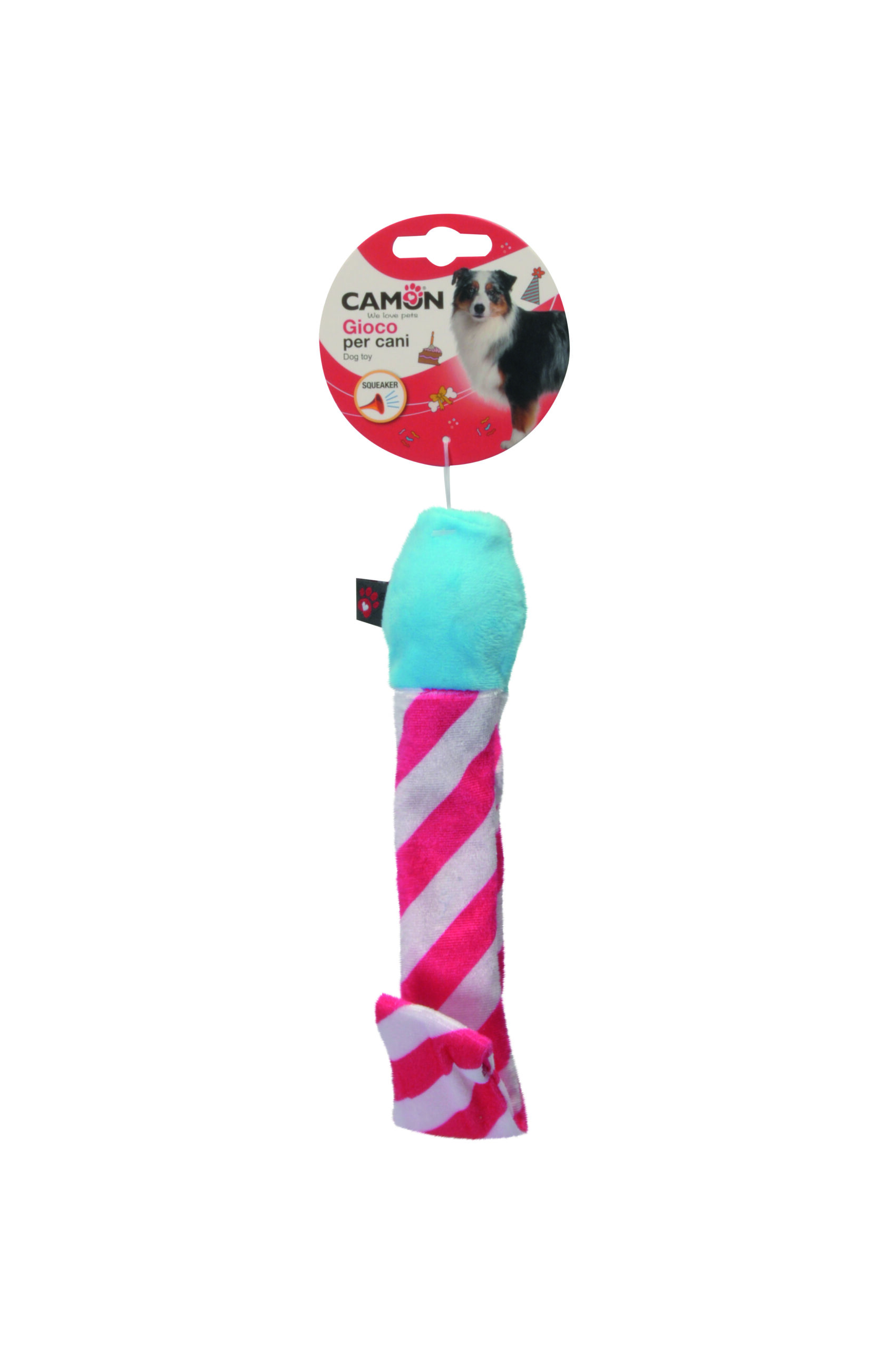 Fun dog toy from the Happy Birthday line by Camon, in the shape of a colorful party blower.